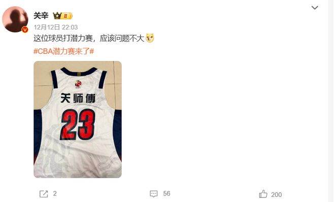广东队的知名跟队记者,报道CBA20多年的关辛也在赛后晒出了一张带有他外号的球衣给出这样的回应:这位球员打潜力赛,应该问题不大。