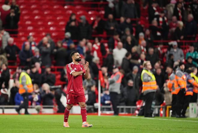 终场哨响后,这位埃及攻击手向安菲尔德球场的四面看台鼓掌致意——他短暂停步,轻拍球衣上的俱乐部徽章,随后在社媒上发布了这一刻的视频——然后消失在球员通道中。